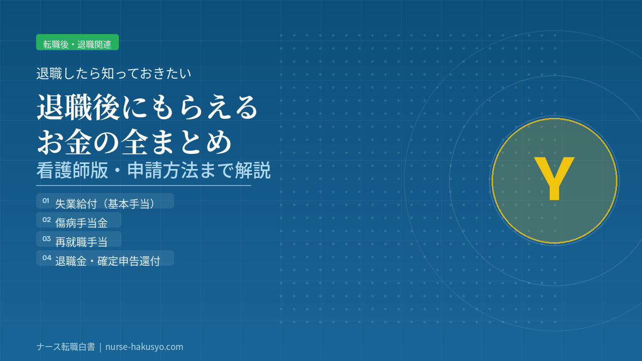 実は、看護師が退職したあとも、申請すれば受け取れるお金が複数あります。失業保険だけでなく、傷病手当金・退職金・再就職手当・教育訓練給付金など、知っているかどうかで手取り総額が大きく変わることも。