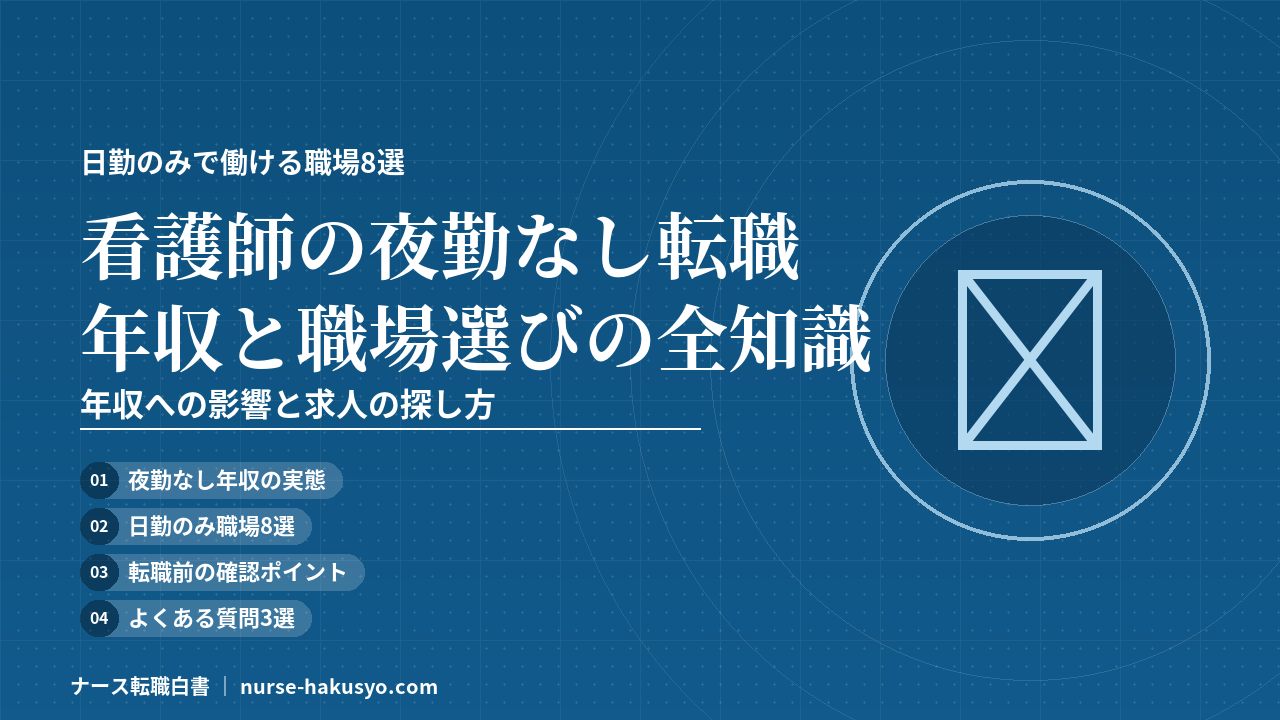 この記事では、看護師が夜勤なしで働く現実的な方法を解説します。年収への影響の実態、日勤のみで働ける職場8選、転職時に失敗しないためのポイントまで、体験談を交えてお伝えします。